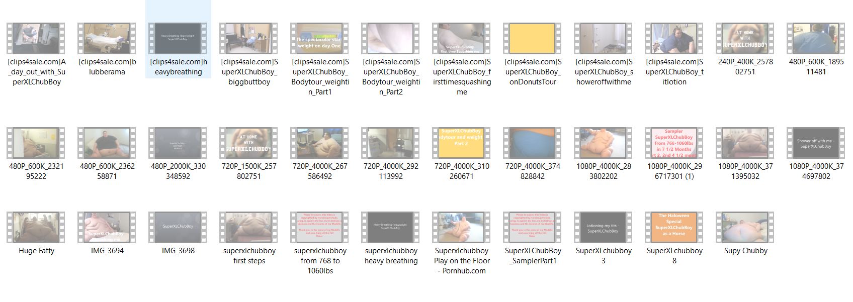 My video collection of this handsome superchub going from 700lbs to 1000lbs. Contains mostly nudity, jiggling and eating. Only one video contains oral sex.